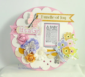 Mulberry paper flowers (one inked to match colour scheme. one left white). Die cut flowers and butterfly, Clear stamp for twirling piece, "Its a Girl" sentiment sticker, Die cut banner and scalloped edge strips